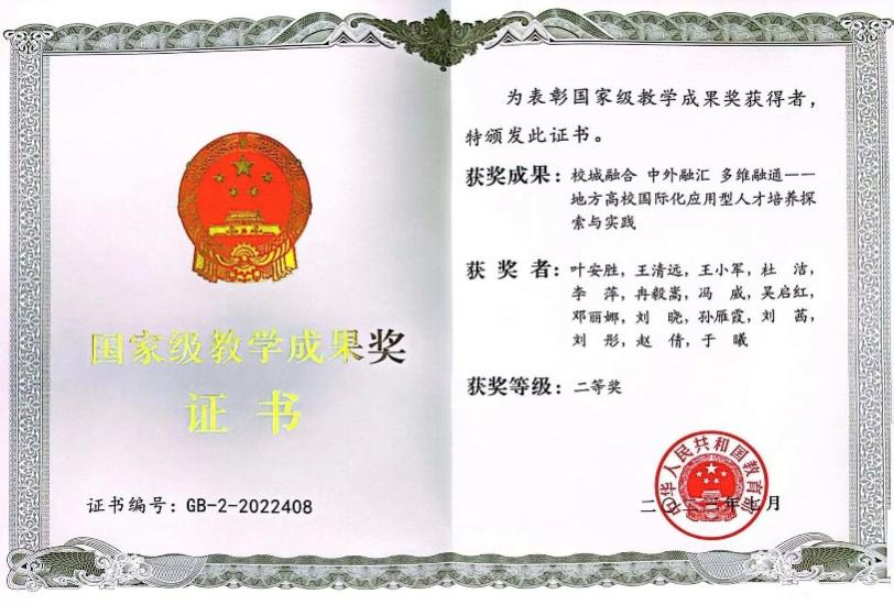 团队教师受惠于九游官方网站外语教师发展分中心OBE理念,积极探索“双师型”教师素养,80%成员兼学者与行业实践者双重身份,充分展现校城融合人才培养的理念。李萍教授作为主要参与人,申报的“校城融合 中外融汇 多维融通—地方高校国际化应用型人才培养探索与实践”课题荣获国家级教学成果奖二等奖,这份二等奖证书的特别之处,或许在于它打破了传统教育改革的"平面叙事",让校城资源、中外智慧、虚实场景在三维空间持续叠加,正如团队在结项报告中所写下的:"教育的终极坐标,永远锚定在时代发展的需求曲线上。"同传专家、亦是国家一流本科课程《英语视听说3》的主讲教师樊皇将课堂教学和自己口译实战经验相结合,让《英语视听说3》课堂变身联合国会议现场,在他的悉心指导下,英语系学子孙含俏,一路从全国口译大赛西南区域赛突围全国总决赛,最终突破性地获得全国二等奖的好成绩。
