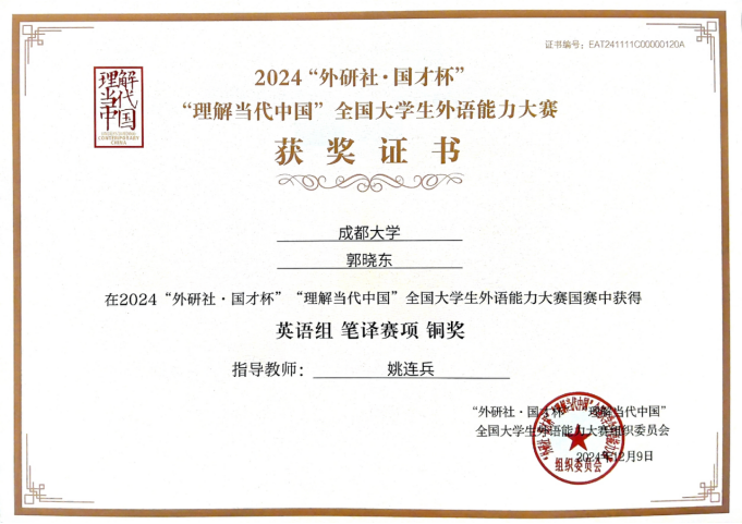 在"外研社·国才杯"全国笔译决赛现场,郭晓东以"Loong Spirit"重构中国龙叙事,贯通红山玉龙图腾与当代航天精神,用诗性译笔让青铜夔纹在英语世界舒展筋脉。这份斩获铜奖的答卷,印证着团队"文化自信先行"的教学哲学。正如指导老师姚连兵教授所言:"当文明基因在译文中跃动时,文字自会架起理解之桥。"